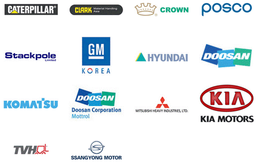 CATERPILLAR CLARK CROWN POSCO STACKPOLE GM KOREA HYUNDAI DOOSAN KOMATSU DOOSAN COPRORATION MITSUBISHI HEAVY INDUSTRIES, LTD. KIA MOTORS TVH SSANGYONG MOTOR